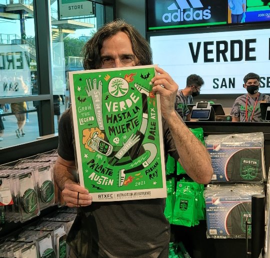 I am grateful for the opportunity to work with @austinfc again. My artwork “Soy verde” is a celebration of the Verde community, the love I have for Austin culture and the game of soccer. It’s a continuation of the “Verde hasta la muerte” drum that I painted at the start of the season to celebrate the MVP player of the game. I feel blessed to be able to make art that connects us with the city. Gracias… ¡Pa’lante Austin!