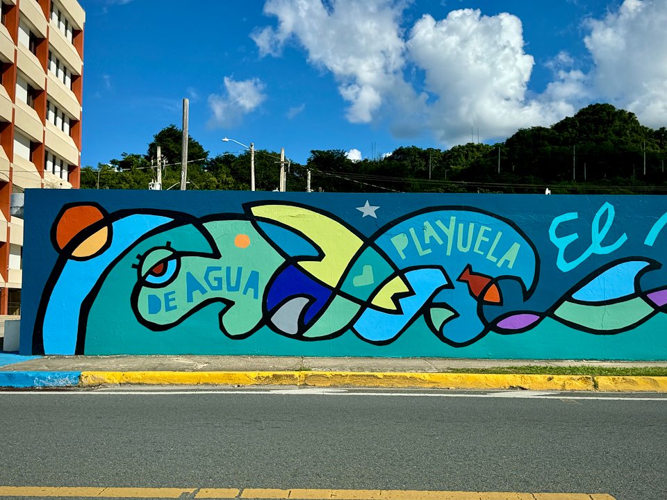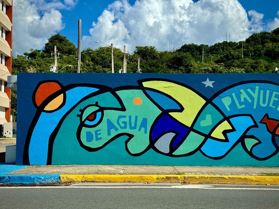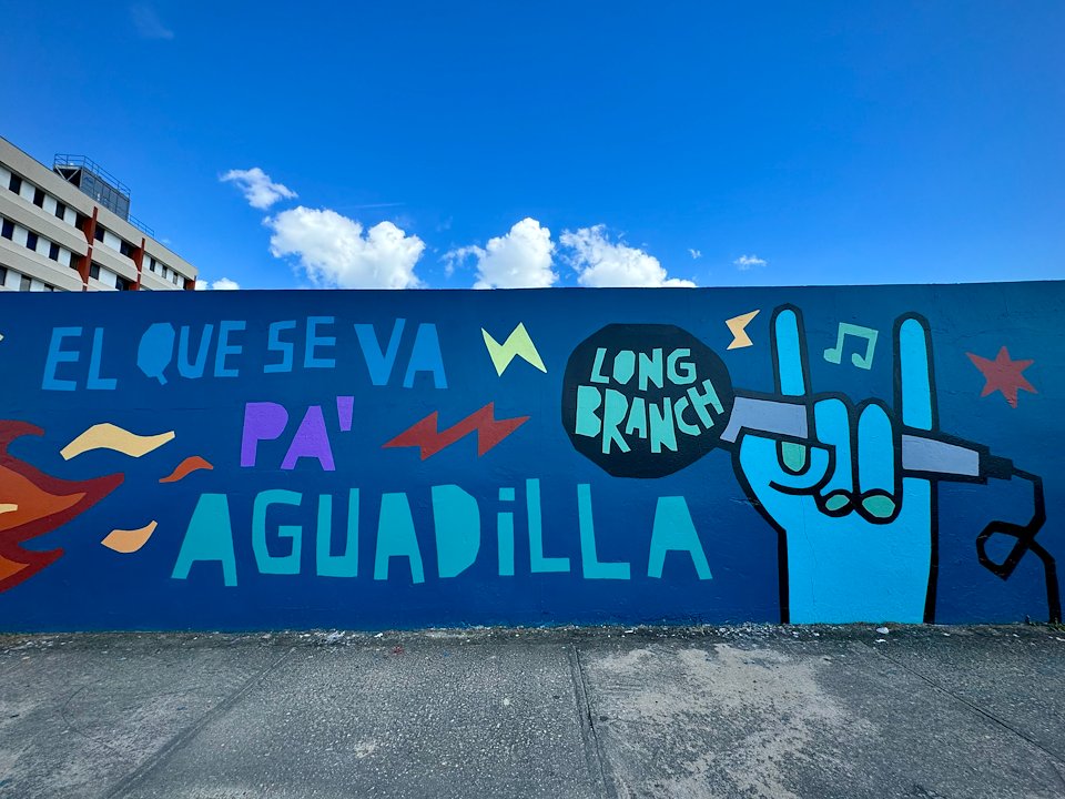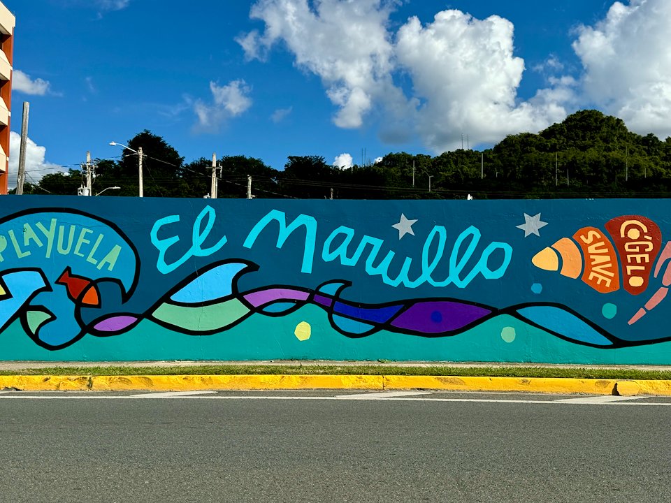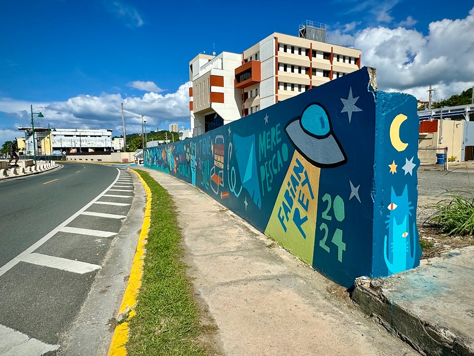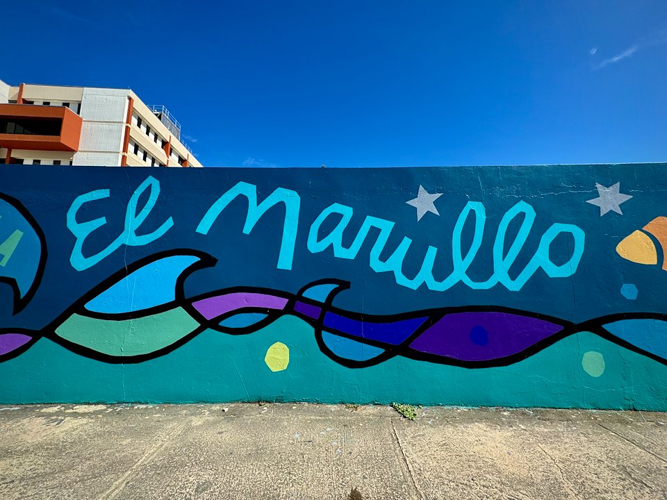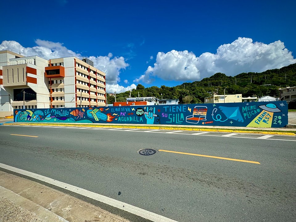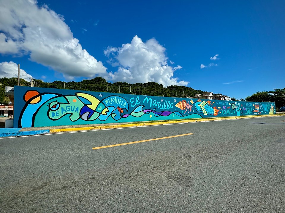 Una celebración vibrante de la resiliencia puertorriqueña y un testimonio de la belleza y de la cultura del pueblo de Aguadilla. El título en sí, “Marullo”, evoca las poderosas olas que rompen contra las costas de la isla, simbolizando la fuerza y vitalidad del pueblo puertorriqueño. Los colores vibrantes del mural captura la esencia de las queridas playas y los paisajes bañados por el sol de Puerto Rico, sirviendo como un poderoso tributo a la fuerza y el espíritu del pueblo puertorriqueño. Su celebración del patrimonio lingüístico rinde homenaje a la rica diversidad de dialectos puertorriqueños. Este mural es un tributo a la linda gente de Aguadilla y su espíritu caribeño.