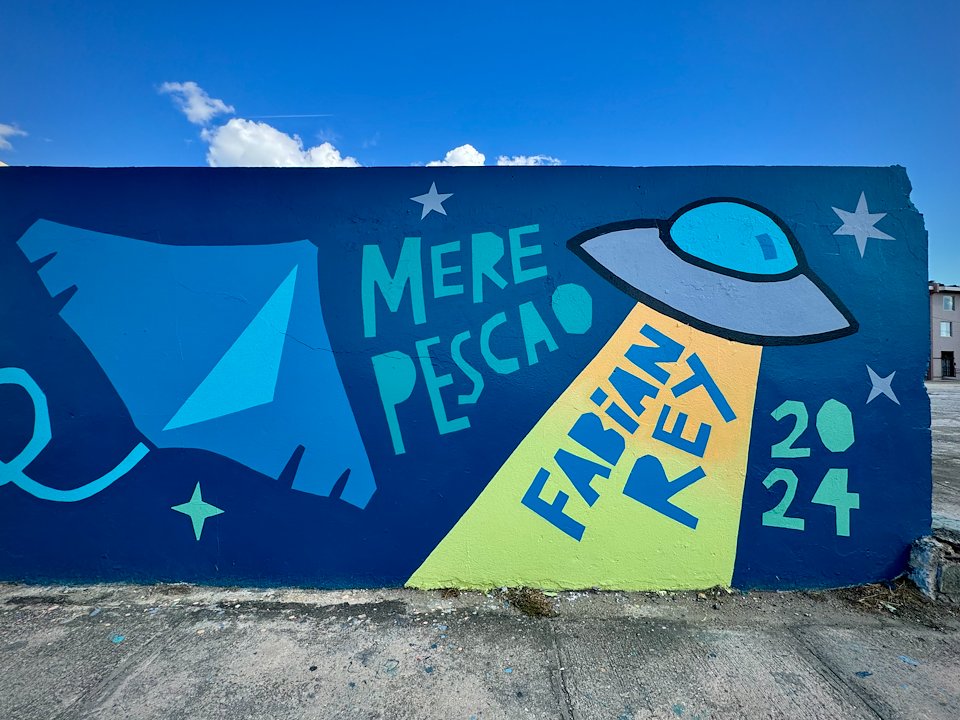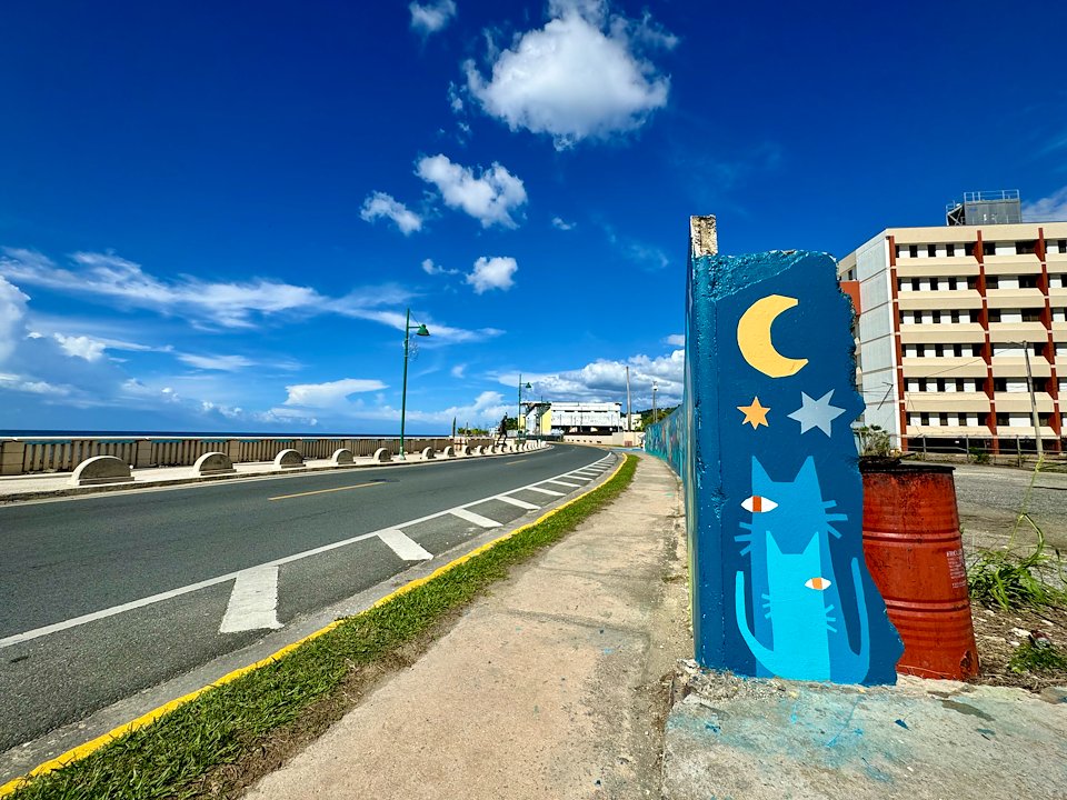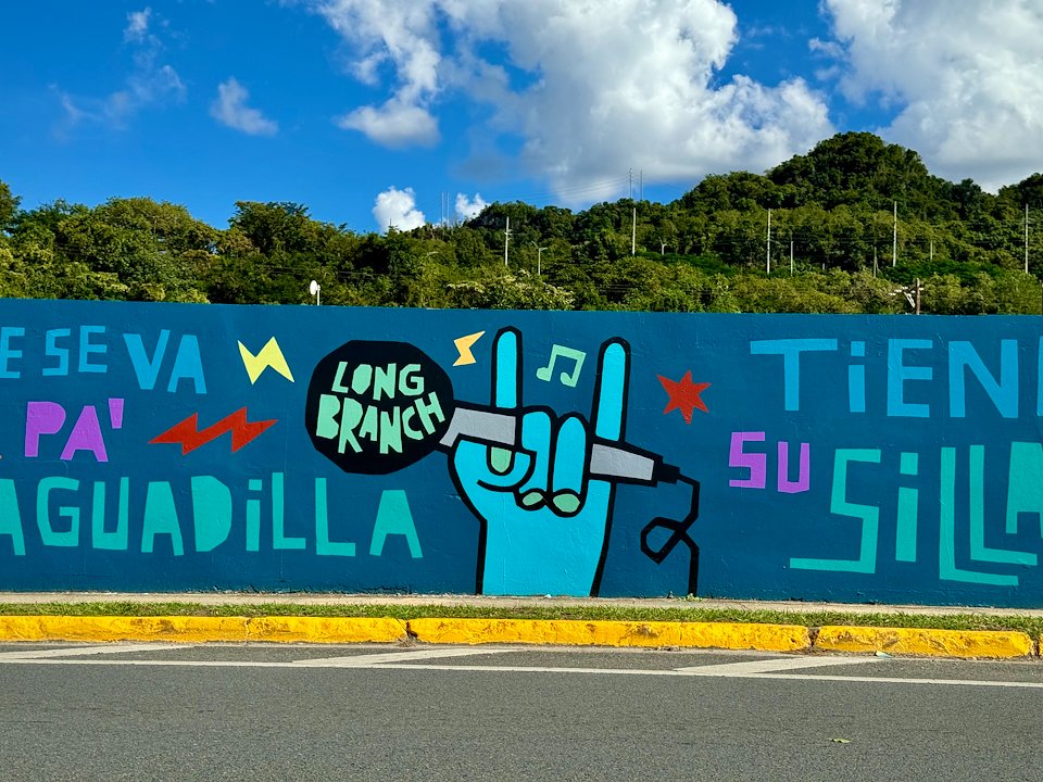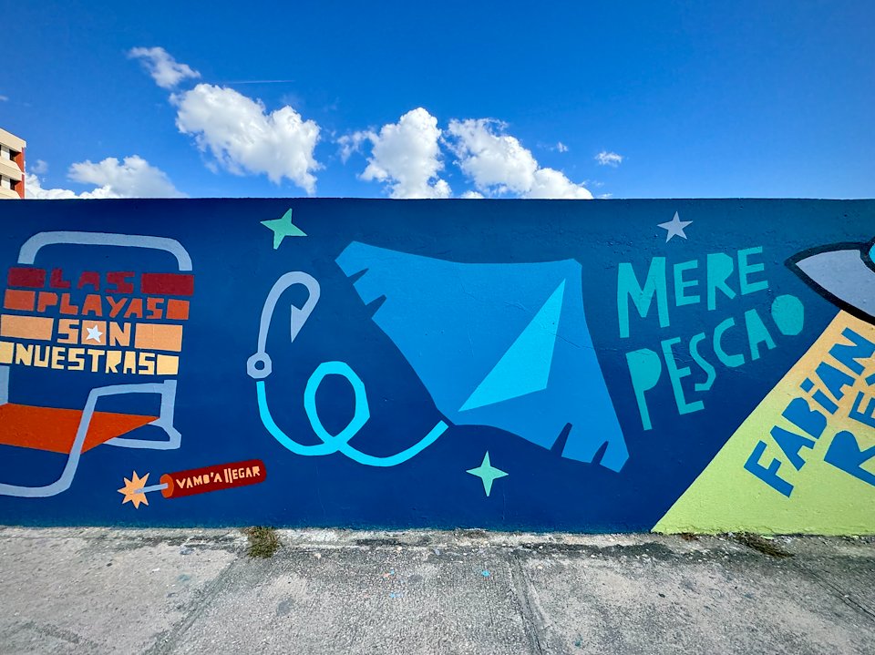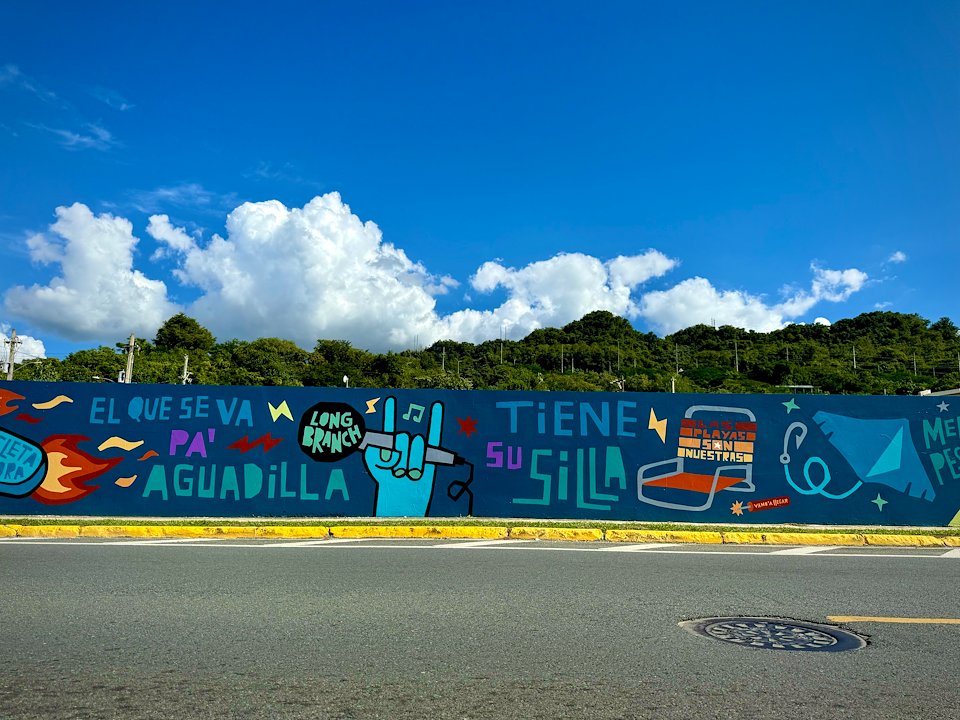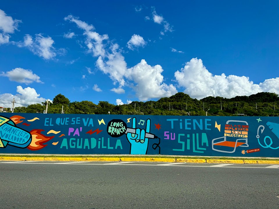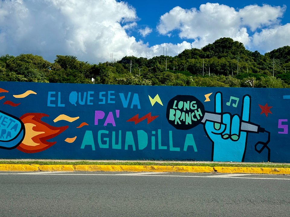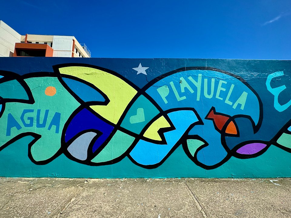 Una celebración vibrante de la resiliencia puertorriqueña y un testimonio de la belleza y de la cultura del pueblo de Aguadilla. El título en sí, “Marullo”, evoca las poderosas olas que rompen contra las costas de la isla, simbolizando la fuerza y vitalidad del pueblo puertorriqueño. Los colores vibrantes del mural captura la esencia de las queridas playas y los paisajes bañados por el sol de Puerto Rico, sirviendo como un poderoso tributo a la fuerza y el espíritu del pueblo puertorriqueño. Su celebración del patrimonio lingüístico rinde homenaje a la rica diversidad de dialectos puertorriqueños. Este mural es un tributo a la linda gente de Aguadilla y su espíritu caribeño.